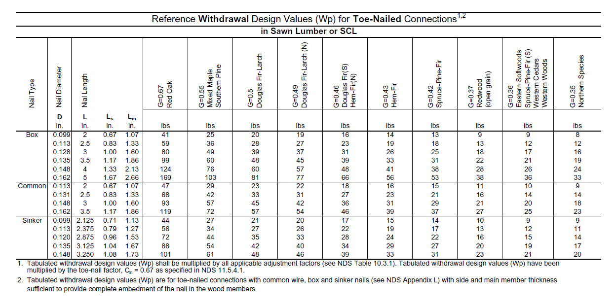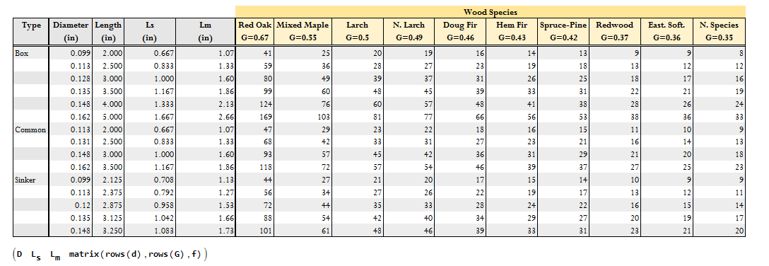 I have been reading some specifications on fastener requirements in carpentry. To ensure that I understand what I am reading, I decided to see if I could duplicate the design values for nailed connections. In this post, I will duplicate a table (Figure 1) for the withdrawal force ratings of various nails when used in a toe-nailed connection. In general, I try to avoid nails with a withdrawal load, but it is an allowed connection and it was easy to duplicate the results in a National Design Specification (NDS) document. I will be performing a similar computation for the lateral load rating in a later post. My Mathcad source and a PDF are stored here.