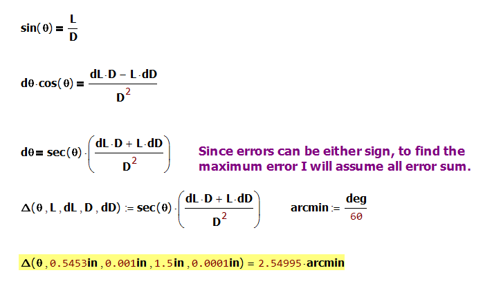Figure 4 shows how I performed my tolerance analysis. In this analysis, I wanted to estimate the impact of tolerance errors in the roller (±0.0001 in) and slip gages (±0.001 in). These errors produce an error in the angle measurement of 2.5 arcminutes.