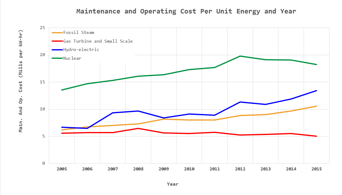 Figure 2 shows how the cost of natural gas, coal, and uranium have varied with time – the water for a hydroelectric plant is considered to be free. The drop in prices of electricity generated by natural gas is entirely accounted for by the price drop in fuel since the plant maintenance and operating costs have not changed much (Figure 3).
