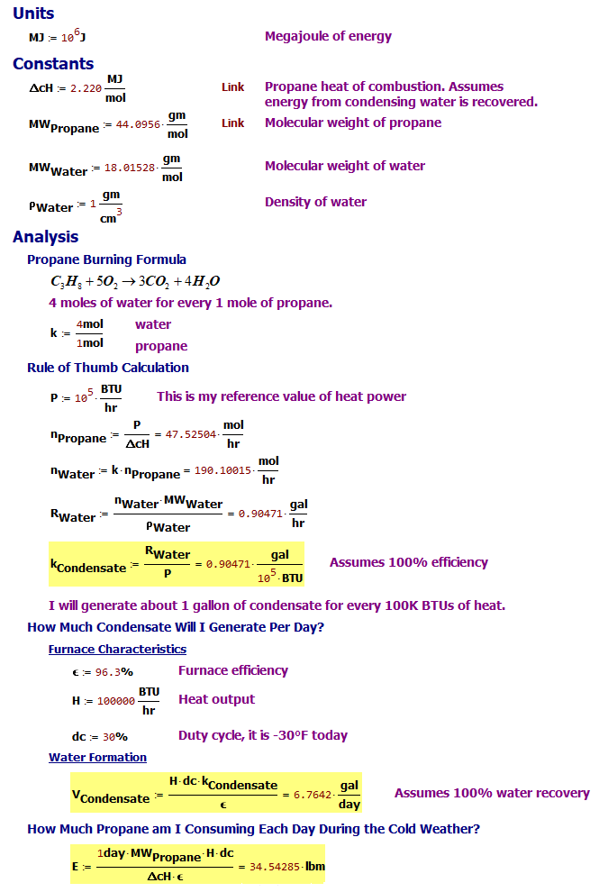 Burning hydrocarbons generates water. We don't think about this water much because it often floats away in the form of steam. In the case of a furnace like mine, this steam is condensed so that its heat of vaporization can be captured and used to heat the building. In the case of a propane system like mine, the amount of water produced by the propane combustion can be computed by looking at the chemical formula for propane combustion (Equation 1).
